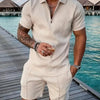 Stay cool and stylish this season with this Men’s Summer Casual Polo Shirt Set. Featuring a modern zipper V-neck polo top and matching drawstring shorts, this lightweight, breathable set delivers easygoing summer style perfect for beach days, lounging, or casual outings.
