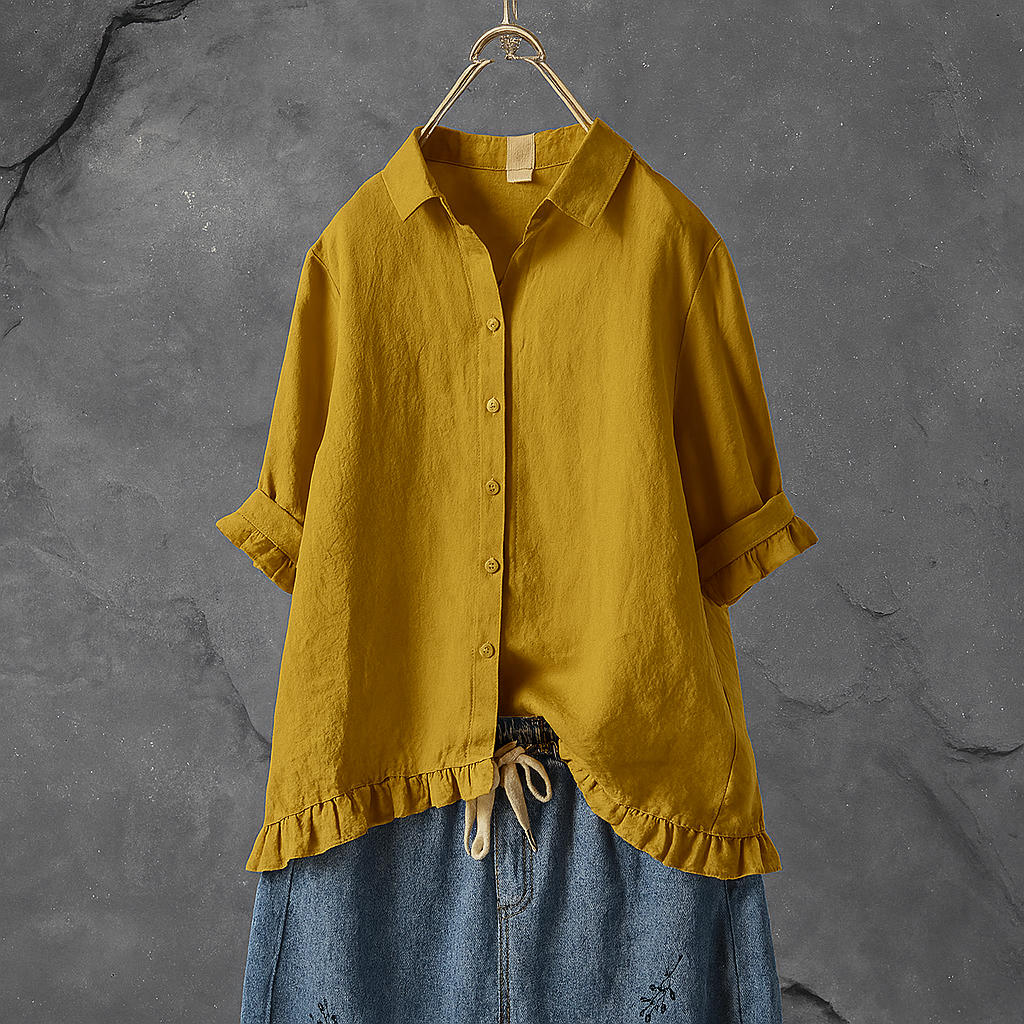 Button Down Cotton Blouse with Ruffled Hem