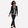 • Contrast Trim: Edging on jacket and pants